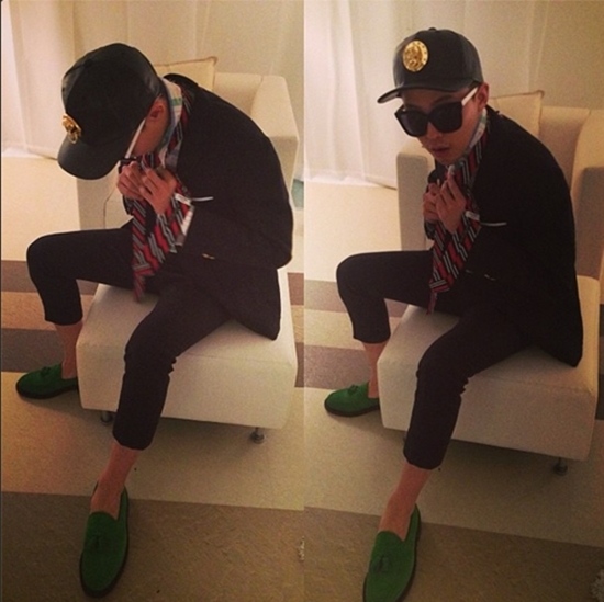 공개된 사진 사진 속에는 고개를 숙여 넥타이를 묶고 있다가 카메라를 응시하고 있는 지드래곤의 모습이 담겨있다. 특히 지드래곤은 튀는 초록색의 신발과 얇은 다리를 자랑해 눈길을 끌었다.