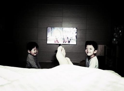사진 속 장진의 두 아들은 TV 앞에서 아빠를 바라보며 환하게 웃고 있다. 특히 사진 속에는 두 아들 앞에 장진의 발이 보여 웃음을 자아냈다.