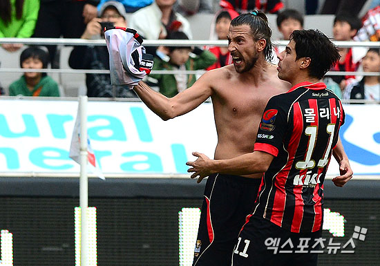 [엑스포츠뉴스 = 권태완 기자] 28일 오후 서울 상암 서울월드컵경기장에서 열린 '2013 K리그' FC서울과 강원FC의 경기에 데얀이 3:2 역전골을 넣고 환호하고 있다.