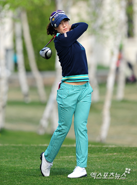 [엑스포츠뉴스=안성, 권혁재 기자] 3일 오전 경기도 안성에 위치한 메이스트로 C.C(18홀/6,417야드)에서 열린 `KG·이데일리 레이디스 오픈` 1라운드 정재은(KB, 24)이 10번홀 티샷을 하고 있다.