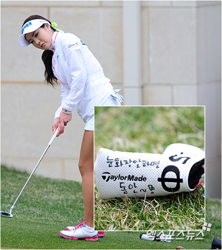 [엑스포츠뉴스=안성, 권혁재 기자] 3일 오전 경기도 안성에 위치한 메이스트로 C.C(18홀/6,417야드)에서 열린 `KG·이데일리 레이디스 오픈` 1라운드 안신애(우리투자증권, 23)가 퍼팅 연습을 하고 있다. 안신애 퍼팅 커버에 재미난 문구를 적어놓았다.