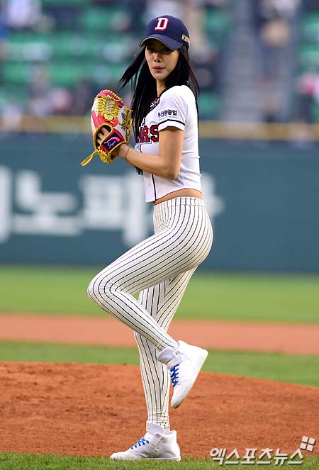 [엑스포츠뉴스 = 잠실, 김성진 기자] 3일 오후 서울 송파구 잠실동 잠실야구장에서 열린 '2013 한국야쿠르트 세븐 프로야구' 두산 베어스와 LG 트윈스의 경기에 시구자로 나선 클라라가 시구를 하고 있다.