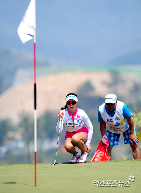[엑스포츠뉴스=안성, 권혁재 기자] 5일 오전 경기도 안성에 위치한 메이스트로 C.C(18홀/6,417야드)에서 열린 `KG·이데일리 레이디스 오픈` 최종라운드 안신애가(우리투자증권, 23)가 2번홀 퍼팅을 위해 캐디와 그린을 분석하고 있다.
