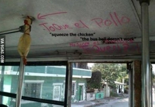 게재된 사진 속에는 한 버스의 내부 모습이 담겨 있다. 버스 안에는 하차 벨이 있어야 할 곳에 장난감 닭이 묶여 있다. 그리고 그 옆에는 '벨이 고장 났으니 내리려면 닭을 쥐어짜시오'라는 설명이 적혀 있다.