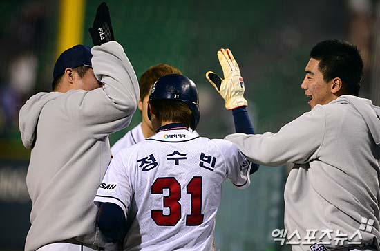 [엑스포츠뉴스 = 잠실, 김성진 기자] 10일 오후 서울 송파구 잠실동 잠실야구장에서 열린 '2013 한국야쿠르트 세븐 프로야구' 두산 베어스와 NC 다이노스의 경기에 8회 말 1사 1,3루 최주환의 내야 땅볼 때 역전 득점을 올린  3루 주자 정수빈(가운데)이 동료 선수들과 하이파이브를 하고 있다.