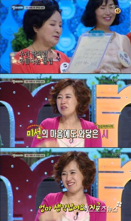 12일 방송된 KBS 2TV '해피선데이 - 맘마미아'에서는 MC 박미선이 박경림 어머니의 창작시에 어머니 생각이 나 눈시울을 붉혀 눈길을 끌었다.