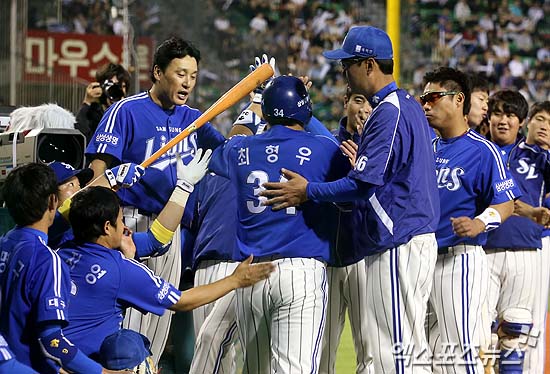 [엑스포츠뉴스 = 잠실, 김성진 기자] 15일 오후 서울 송파구 잠실동 잠실야구장에서 열린 '2013 한국야쿠르트 세븐 프로야구' 두산 베어스와 삼성 라이온즈의 경기에 5회 초 무사 최형우가 솔로홈런을 터뜨리고 덕아웃에서 동료들과 하이파이브를 하고 있다.