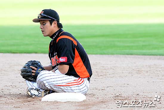 [엑스포츠뉴스 = 인천, 김성진 기자] 17일 오후 인천 남구 문학동 문학야구장에서 열린 '2013 한국야쿠르트 세븐 프로야구' SK 와이번스와 롯데 자이언츠의 경기에 7회 말 1사 1,3루 김상현의 내야 땅볼 타구를 병살타로 연결시키지 못한 롯데 2루수 정훈이 자책하고 있다.