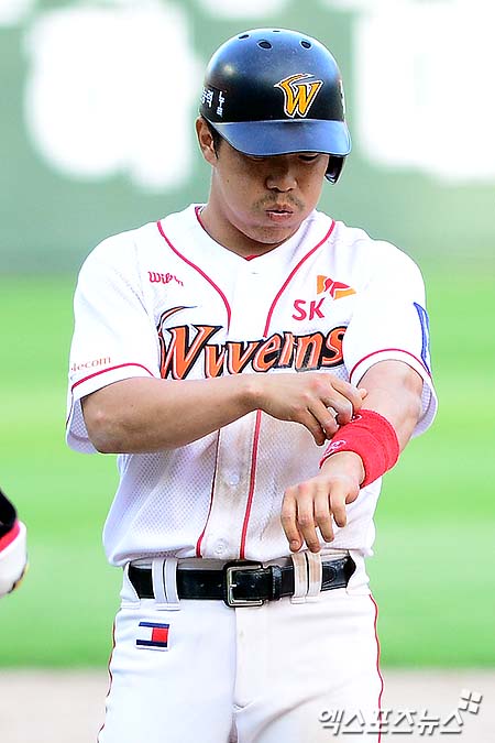 [엑스포츠뉴스 = 인천, 김성진 기자] 17일 오후 인천 남구 문학동 문학야구장에서 열린 '2013 한국야쿠르트 세븐 프로야구' SK 와이번스와 롯데 자이언츠의 경기에 8회 말 2사 1,2루 정근우가 1타점 2루타를 때려낸 후 숨을 고르고 있다.