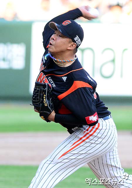 [엑스포츠뉴스 = 인천, 김성진 기자] 17일 오후 인천 남구 문학동 문학야구장에서 열린 '2013 한국야쿠르트 세븐 프로야구' SK 와이번스와 롯데 자이언츠의 경기에 롯데 김사율이 역투를 펼치고 있다.