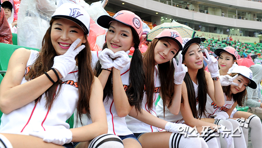 [엑스포츠뉴스=문학, 권혁재 기자]18일 오후 인천 문학야구장에서 열린 '2013 한국야쿠르트 세븐 프로야구' SK 와이번스와 롯데 자이언츠의 경기 SK 치어리더들이 비가 내리는 날씨에도 밝은 표정으로 포즈를 취하고 있다.