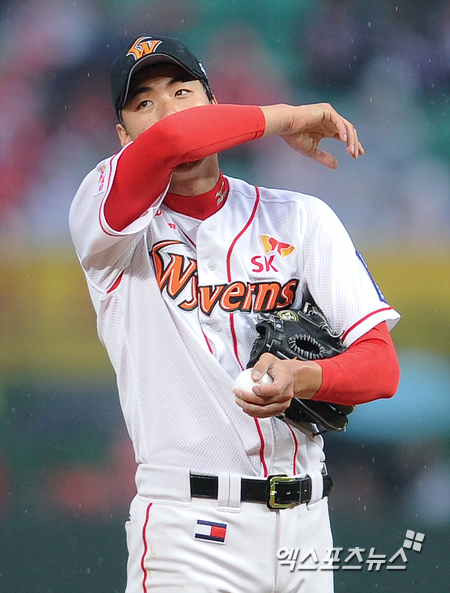 [엑스포츠뉴스=문학, 권혁재 기자]18일 오후 인천 문학야구장에서 열린 '2013 한국야쿠르트 세븐 프로야구' SK 와이번스와 롯데 자이언츠의 경기 롯데가 4-3으로 앞선 5회초 SK 선발투수 김광현이 마운드에서 얼굴에 내린 빗물을 닦아내고 있다.