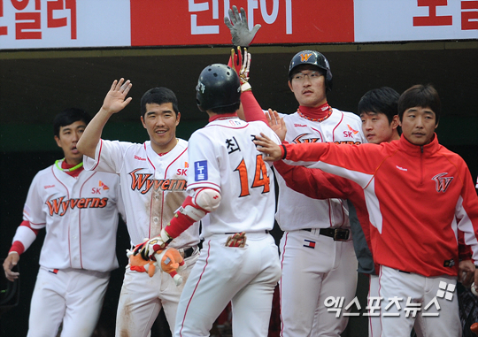 [엑스포츠뉴스=문학, 권혁재 기자]18일 오후 인천 문학야구장에서 열린 '2013 한국야쿠르트 세븐 프로야구' SK 와이번스와 롯데 자이언츠의 경기 롯데가 4-3으로 앞선 5회말 SK 최정이 좌월 동점 솔로포를 날리고 들어와 동료들의 축하를 받고 있다.