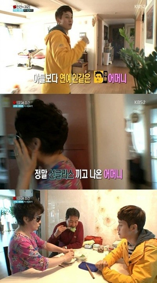 허경환의 어머니는 카메라가 다가오자 부끄러워하며 급히 방문 뒤에 숨었다. 이에 허경환은 "어머니가 화장을 안 했다"며 "아들보다 더 연예인 같다. 선글라스라도 착용하고 나오라"고 말해 웃음을 선사했다.