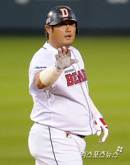 [엑스포츠뉴스=권혁재 기자] 21일 오후 서울 잠실야구장에서 열린 '2013 한국야쿠르트 세븐 프로야구' 두산 베어스와 넥센 히어로즈의 경기 4회말 1아웃 1루 두산 최준석이 우중간 안타를 날리고 넥센 중견수 실책을 틈타 2루까지 진루 타임을 부르고 있다. 1루주자 윤석민 홈인.