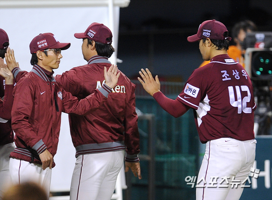 넥센 염경엽 감독이 그라운드로 나와 선수들과 하이파이브 하고 있다.