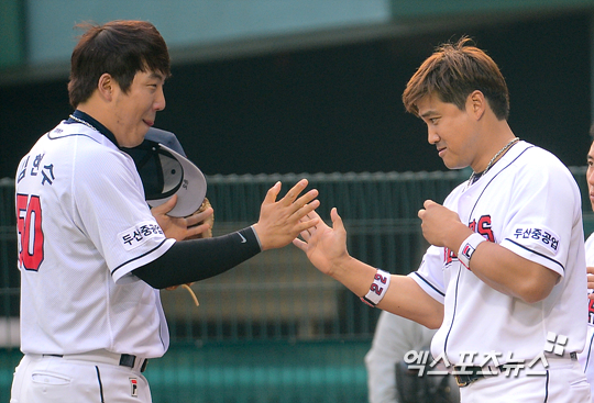 [엑스포츠뉴스=권혁재 기자] 23일 오후 잠실야구장에서 열린 '2013 한국야쿠르트 세븐 프로야구' 두산 베어스와 넥센 히어로즈의 경기 1회초 두산 홍성흔이 수비를 마치고 들어오는 김현수와 하이파이브 하고 있다.
