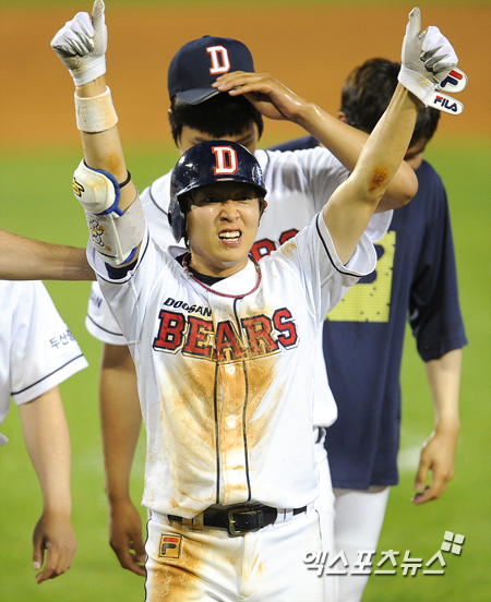 연장 11회 1아웃 만루 끝내기 적시타를 날리 정수빈이 관중석을 향해 세레모니를 하고 있다.