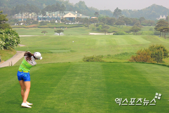 [엑스포츠뉴스=춘천, 권혁재 기자] 25일 오전 강원도 춘천시 라데나 골프클럽(파72/6,469야드)에서 열린 '2013 두산 매치플레이 챔피언십' 16강(3R) 경기 윤채영이(26, 한화)이 9번홀 티샷을 하고 있다.