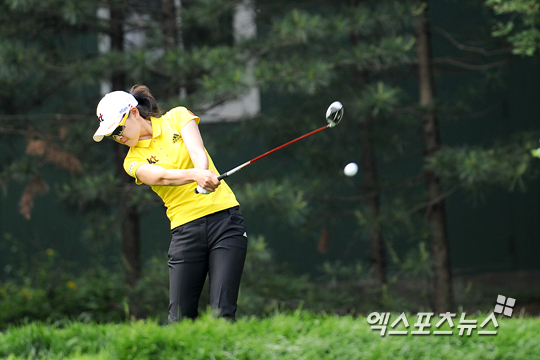 [엑스포츠뉴스=춘천, 권혁재 기자] 26일 오전 강원도 춘천시 라데나 골프클럽(파72/6,469야드)에서 열린 '2013 두산 매치플레이 챔피언십' 4강(5R) 경기 이정민(21, KT)이 5번홀 티샷을 하고 있다.