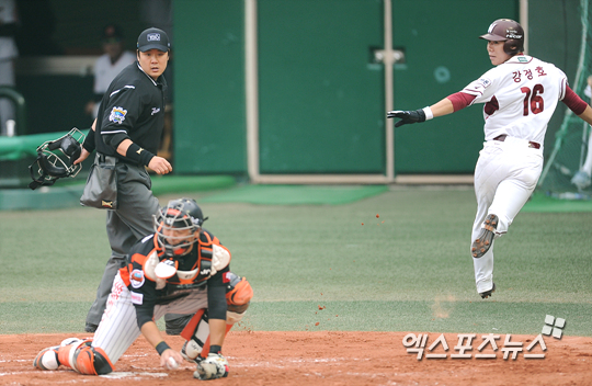 [엑스포츠뉴스=권혁재 기자] 26일 오후 목동야구장에서 열린 '2013 한국야쿠르트 세븐 프로야구' 넥센 히어로즈와 롯데 자이언츠의 경기 1회말 2아웃 1, 2루 넥센 오윤의 중전안타에 2루주자 강정호가 홈까지 쇄도했으나 홈을 밟지않아 아웃 당하고 있다.