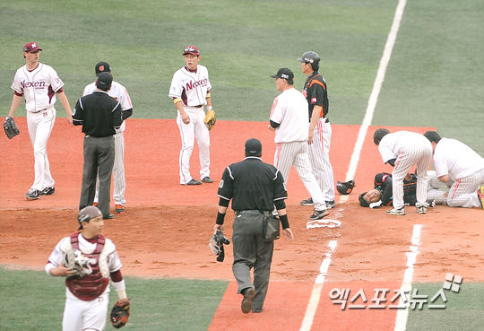 [엑스포츠뉴스=권혁재 기자] 26일 오후 서울 목동구장에서 열린 '2013 한국야쿠르트 세븐 프로야구' 넥센 히어로즈와 롯데 자이언츠의 경기 넥센에 2-1로 앞선 3회초 롯데 김문호가 투수 오른쪽 번트를 치고 베이스 런닝을 하다 부상을 당하여 그라운드에 쓰러져 있다.