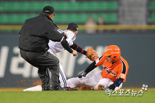 [엑스포츠뉴스=권혁재 기자] 28일 오후 잠실야구장에서 열린 '2013 한국야쿠르트 세븐 프로야구' LG 트윈스와 한화 이글스의 경기 한화가 1-0으로 앞선 2회초 한화 최진행이 중전안타를 치고 2루까지 진루 슬라이딩 세이프 되고 있다.