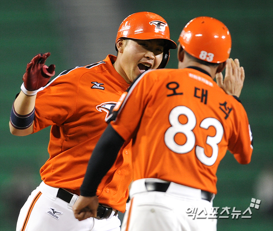 [엑스포츠뉴스=권혁재 기자] 28일 오후 잠실야구장에서 열린 '2013 한국야쿠르트 세븐 프로야구' LG 트윈스와 한화 이글스의 경기 8회초 한화 김태완이 시즌 첫 홈런을 쏘아 올리고 3루 오대석 코치와 하이파이브 하고 있다.