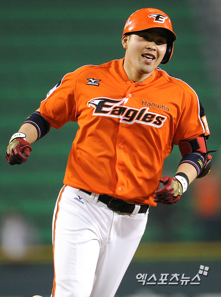 [엑스포츠뉴스=권혁재 기자] 28일 오후 잠실야구장에서 열린 '2013 한국야쿠르트 세븐 프로야구' LG 트윈스와 한화 이글스의 경기 8회초 한화 김태완이 시즌 첫 홈런을 쏘아 올리고 그라운드를 달리고 있다.