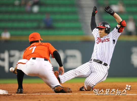 [엑스포츠뉴스=권혁재 기자] 29일 오후 잠실야구장에서 열린 '2013 한국야쿠르트 세븐 프로야구' LG 트윈스와 한화 이글스의 경기, LG가 2-0으로 앞선 3회말 1아웃 1루 LG 정의윤이 1타점 적시타에 3루까지 진루 송구된 공이 빠지며 슬라이딩 세이프 되고 있다.