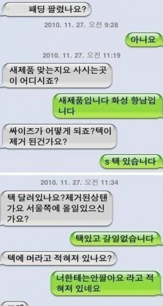 "패딩 팔렸나요?"라고 묻는 예비구매자에게 판매자는 "아니요"라고 대답했다. 이에 구매자는 "새제품이 맞느냐" "사는 곳이 어디냐" "사이즈가 어떻게 되느냐"며 상세 내용을 물었다.