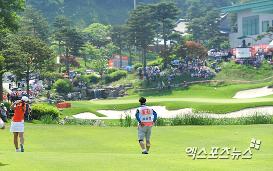 김보경이 캐디로 함께하는 아버지 김정원(56)씨와 함께 마지막 18번홀 세컨샷을 하고 날아가는 공을 바라보고 있다.