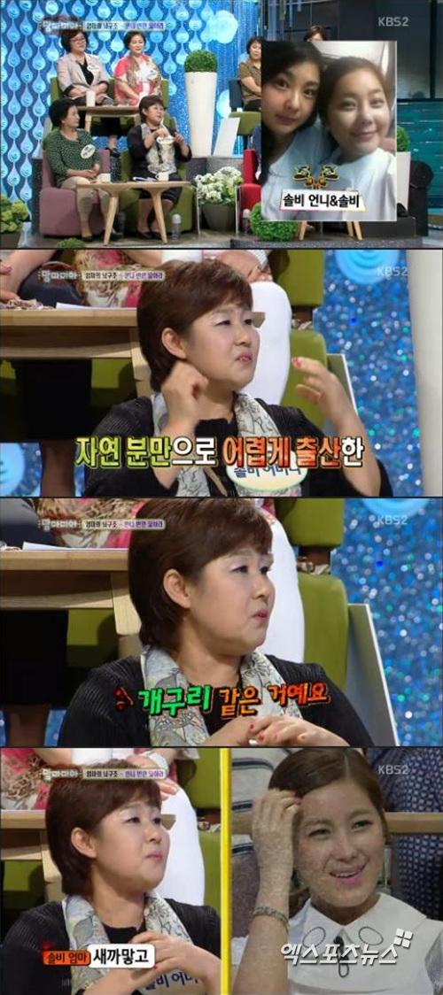 이날 솔비 어머니는 솔비에 대해 "솔비 언니는 예뻤다. 그런데 솔비는 자연분만으로 끄집어내서 그런지 머리 모양이 이상했다"고 말했다.