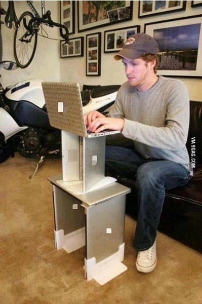 '책상 살 돈 없는 이유 사진' 속 한 남성은 소파에 앉아 노트북을 사용하고 있다. 남성의 포즈가 왠지 불편해 보이는 것은 책상으로 노트북 4개로 받침대를 만들어 사용하고 있기 때문이다.