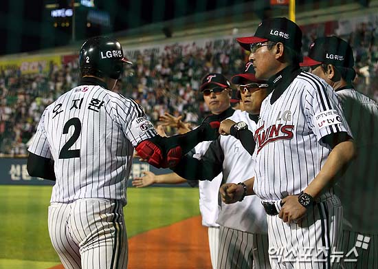 [엑스포츠뉴스 = 김성진 기자] 4일 오후 서울 송파구 잠실동 잠실야구장에서 열린 '2013 한국야쿠르트 세븐 프로야구' LG 트윈스와 두산 베어스의 경기에 LG 김기태 감독(오른쪽)이 8회 말 무사 솔로홈런을 터뜨린 오지환과 하이파이브를 하고 있다.