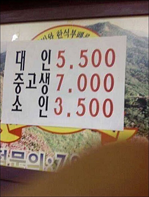 사진 속에는 한 뷔페식당의 가격표의 모습이 담겨 있다. 특히 이 메뉴판은 대인 5500원, 중고생 7000원으로 중고생의 요금이 대인보다 더 높다.