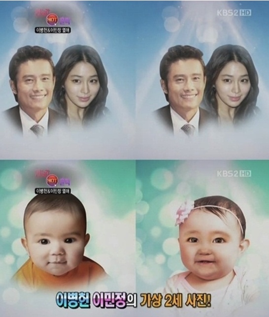 지난해 8월 방송된 KBS2 '연예가중계'에서는 이병헌과 이민정의 가상 2세 합성사진이 공개됐다. 이는 제작진이 이들의 열애 소식을 보도하면서 가상 2세 사진을 만든 것이다.