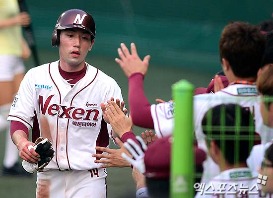 [엑스포츠뉴스 = 김성진 기자] 5일 오후 서울 양천구 목동 목동야구장에서 열린 '2013 한국야쿠르트 세븐 프로야구' 넥센 히어로즈와 삼성 라이온즈의 경기에 1회 말 무사 1,3루 이택근의 희생플라이 때 홈을 밟은 3루주자 서건창(왼쪽)이 동료들과 하이파이브를 하고 있다.