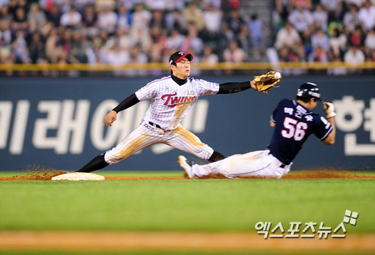 [엑스포츠뉴스=권혁재 기자] 5일 오후 서울 송파구 잠실야구장에서 열린 '2013 한국야쿠르트 세븐 프로야구' LG 트윈스와 두산 베어스의 경기, LG가 4-3으로 앞선 8회초 무사 1루 LG 유격수 오지환이 2루 도루를 시도하는 두산 박건우에게 태그를 시도하고 있다.