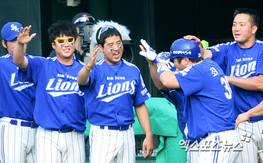 [엑스포츠뉴스=권혁재 기자] 6일 오후 서울 양천구 목동야구장에서 열린 '2013 한국야쿠르트 세븐 프로야구' 넥센 히어로즈와 삼성 라이온즈의 경기, 5-5- 동점인 7회초 2아웃 2루 삼성 최형우가 우중간 투런포를 날리고 들어와 동료들과 하이파이브 하고 있다.
