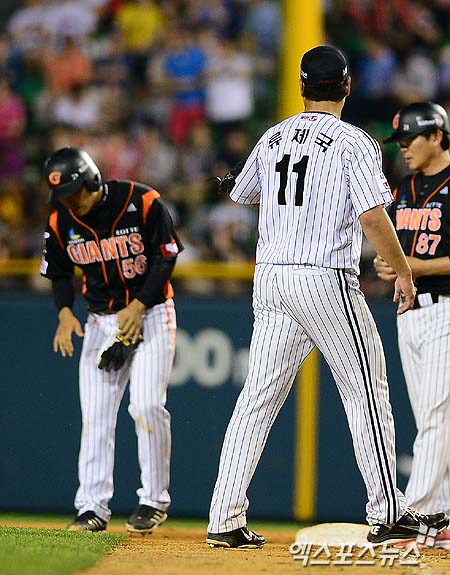 [엑스포츠뉴스 = 김성진 기자] 7일 오후 서울 잠실야구장에서 열린 '2013 한국야쿠르트 세븐 프로야구' LG 트윈스와 롯데 자이언츠의 경기에 8회 초 무사 2,3루 신본기의 타석 때 신본기를 몸에 맞춘 LG 선발 류제국이 신본기에게 사과를 하고 있다.