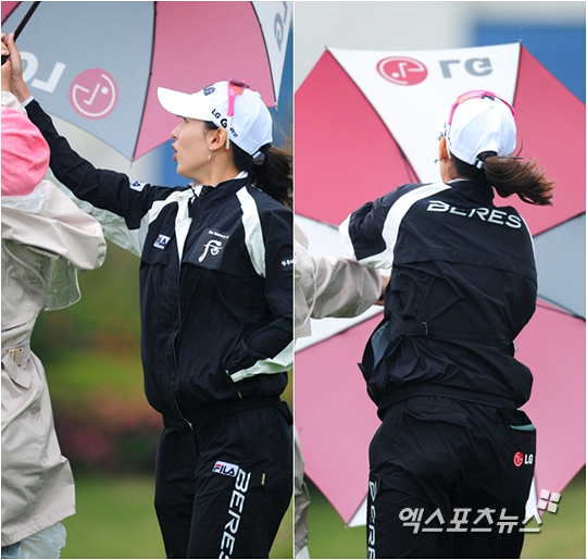 [엑스포츠뉴스=제주, 권혁재 기자] 8일 오전 제주도 서귀포시 롯데스카이힐제주 컨트리클럽(파72/6,288야드)에서 열린 '제 3회 롯데 칸타타 여자오픈'(총상금 5억, 우승상금 1억) 2라운드 경기, 김자영(22, LG)이 우산을 쓰고 10번홀로 이동을 하던 중 강한 바람에 날아가는 우산을 붙잡고 있다.