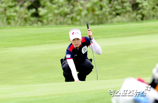 [엑스포츠뉴스=제주, 권혁재 기자] 9일 오전 제주도 서귀포시 롯데스카이힐제주 컨트리클럽(파72/6,288야드)에서 열린 '제 3회 롯데 칸타타 여자오픈'(총상금 5억, 우승상금 1억) 3라운드 경기, 김자영(22, LG)이 8번홀 퍼팅을 위해 라이를 살피고 있다.