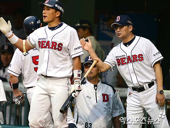 [엑스포츠뉴스 = 김성진 기자] 13일 오후 서울 잠실야구장에서 열린 '2013 한국야쿠르트 세븐 프로야구' 두산 베어스와 SK 와이번스의 경기에 두산 김진욱 감독이 2회 말 2사 2,3루 최재훈의 2타점 적시타 때 홈을 밟은 윤석민(왼쪽)과 하이파이브를 하고 있다.