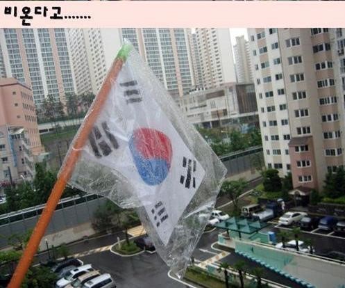한 초등학생이 태극기가 비에 맞아 젖을 것을 염려해 비닐을 씌운 뒤 창 밖에 걸어 놨던 것.
