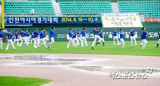 [엑스포츠뉴스=인천, 권혁재 기자] 18일 오후 인천 문학야구장에서 열릴 '2013 한국야쿠르트 세븐 프로야구' SK 와이전스와 삼성 라이온즈의 경기, 삼성 이승엽이 개인 통산 최다홈런 신기록을 눈앞에 둔 가운데 장맛비로 물이 고인 그라운드에서 삼성 선수들이 몸을 풀고 있다.