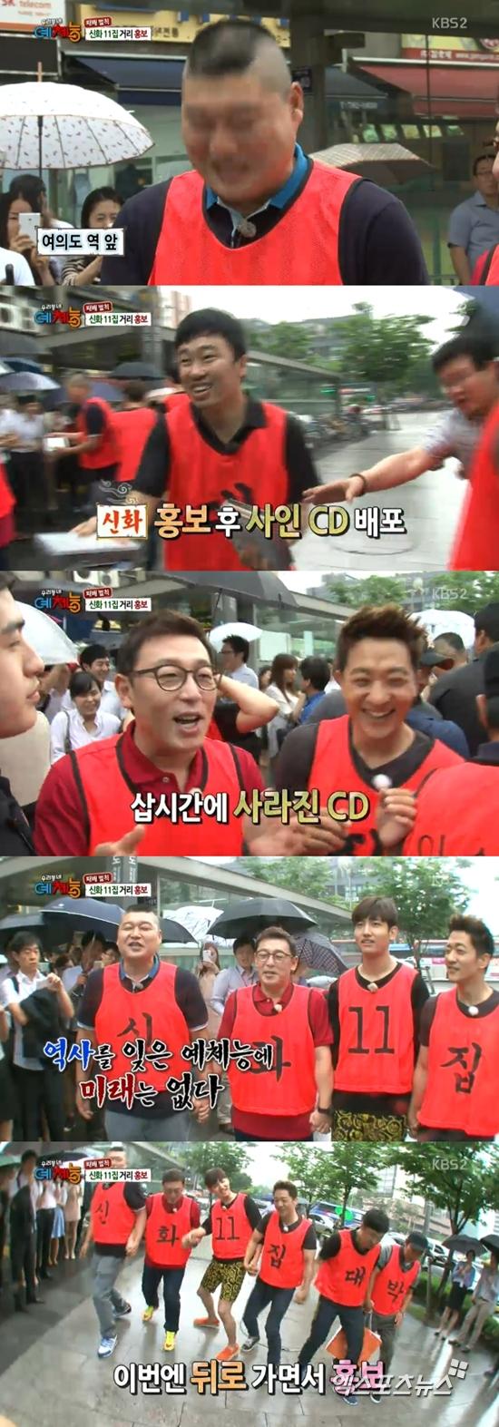 이날 예체능팀은 '신화 11집 대박'이라고 적힌 단체 티를 입고 앨범 홍보를 하기 위해 여의도역 지하철 출입구로 나섰다.
