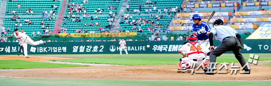 [엑스포츠뉴스=인천, 권혁재 기자] 19일 오후 인천 문학야구장에서 열린 '2013 한국야쿠르트 세븐 프로야구' SK 와이번스와 삼성 라이온즈의 경기, 삼성이 1-0으로 앞선 4회초 선두타자로 나온 삼성 이승엽이 룩킹 삼진을 당하고 있다.