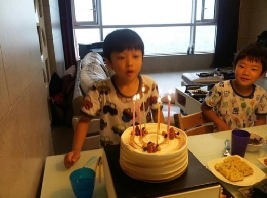 사진 속 김정민의 두 아들은 귀여운 자동차가 그려진 내복을 입고 케이크 앞에 앉아 있다. 첫째 태양이는 케이크의 불을 끄고 있고 둘째는 옆에서 형의 모습을 바라보며 웃음 지었다.
