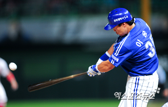 [엑스포츠뉴스=인천, 권혁재 기자] 20일 오후 인천 문학야구장에서 열린 '2013 한국야쿠르트 세븐 프로야구' SK 와이번스와 삼성 라이온즈의 경기, 삼성이 4-2로 앞선 7회초 2아웃 1루 삼성 이승엽이 우전안타를 날리고 있다.